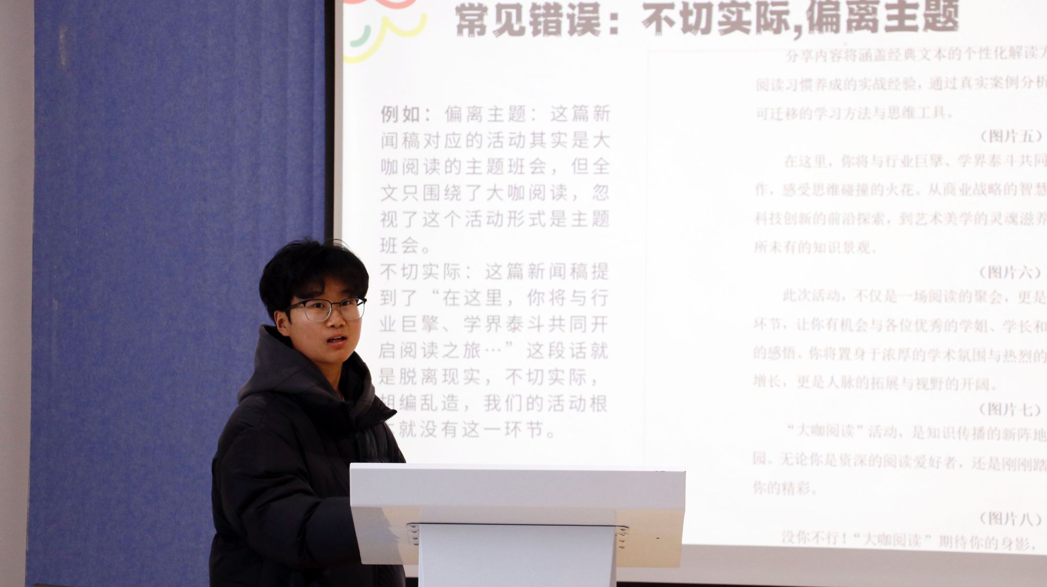 针对新闻稿撰写中的常见误区,李梦雪结合具体案例逐一警示:一是警惕偏离主题,例如某“大咖阅读主题班会” 新闻稿仅围绕阅读内容展开,却忽视了 “主题班会” 这一核心活动形式;二是杜绝不切实际的表述,像 “与行业巨擎、学界泰斗共同开启阅读之旅” 这类脱离活动实际的内容需坚决规避;三是避免废话冗余,强调开头应直切活动目的与主题,做到简洁精炼,无需多余铺垫。