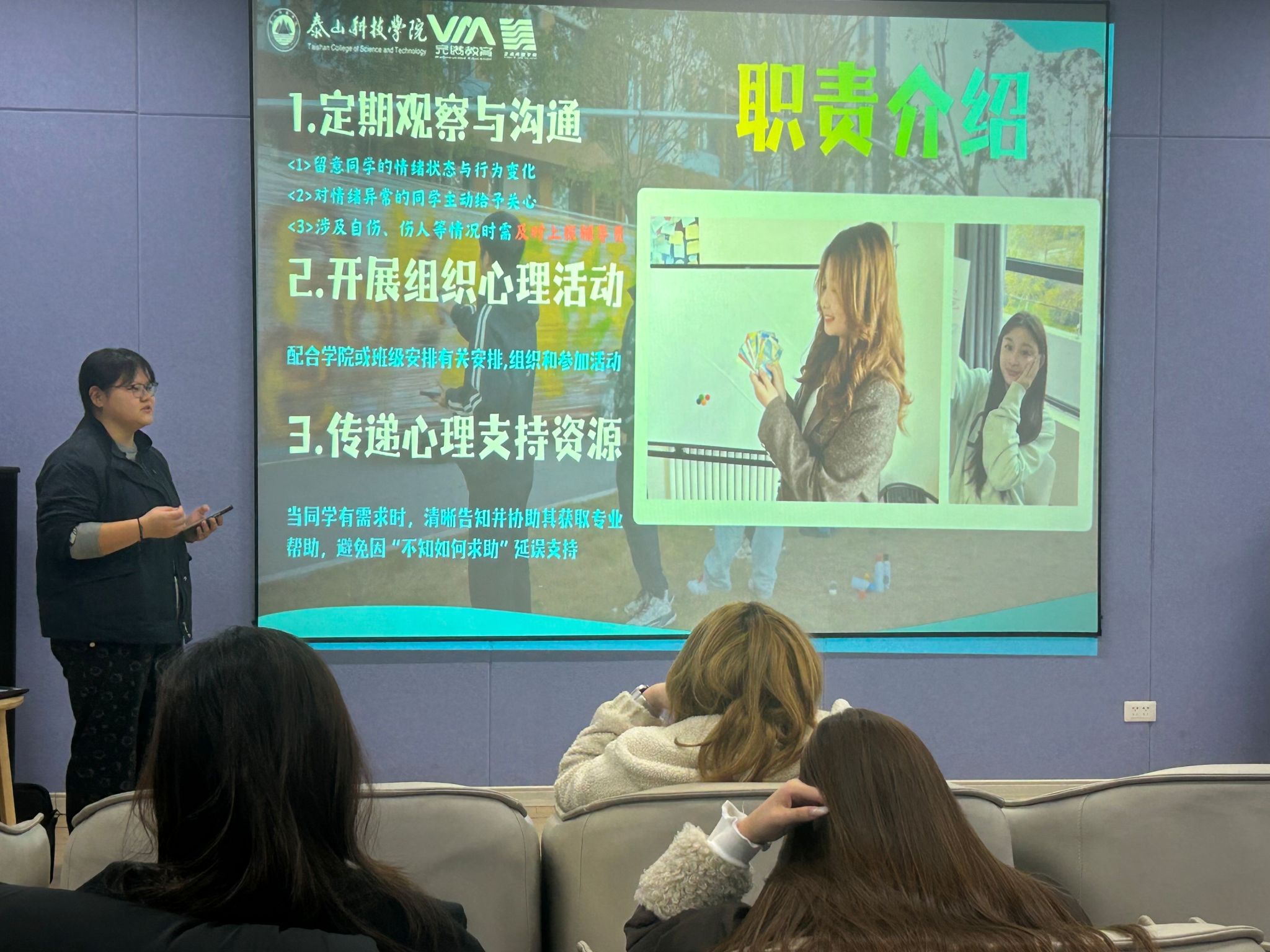 随后,张绮娜围绕校园心理活动开展与材料审核工作进行了细致讲解。心理活动形式丰富多样,涵盖心理健康月、心理情景剧展演等,旨在通过多元化活动帮助同学们缓解压力、调节情绪。针对材料审核,从活动策划、过程记录到完结材料,逐一讲解活动要点与注意事项,确保心理活动材料完整、真实反映活动成效,为心理委员今后独立组织开展班级心理活动提供了清晰的操作指引。