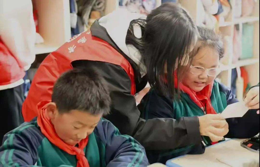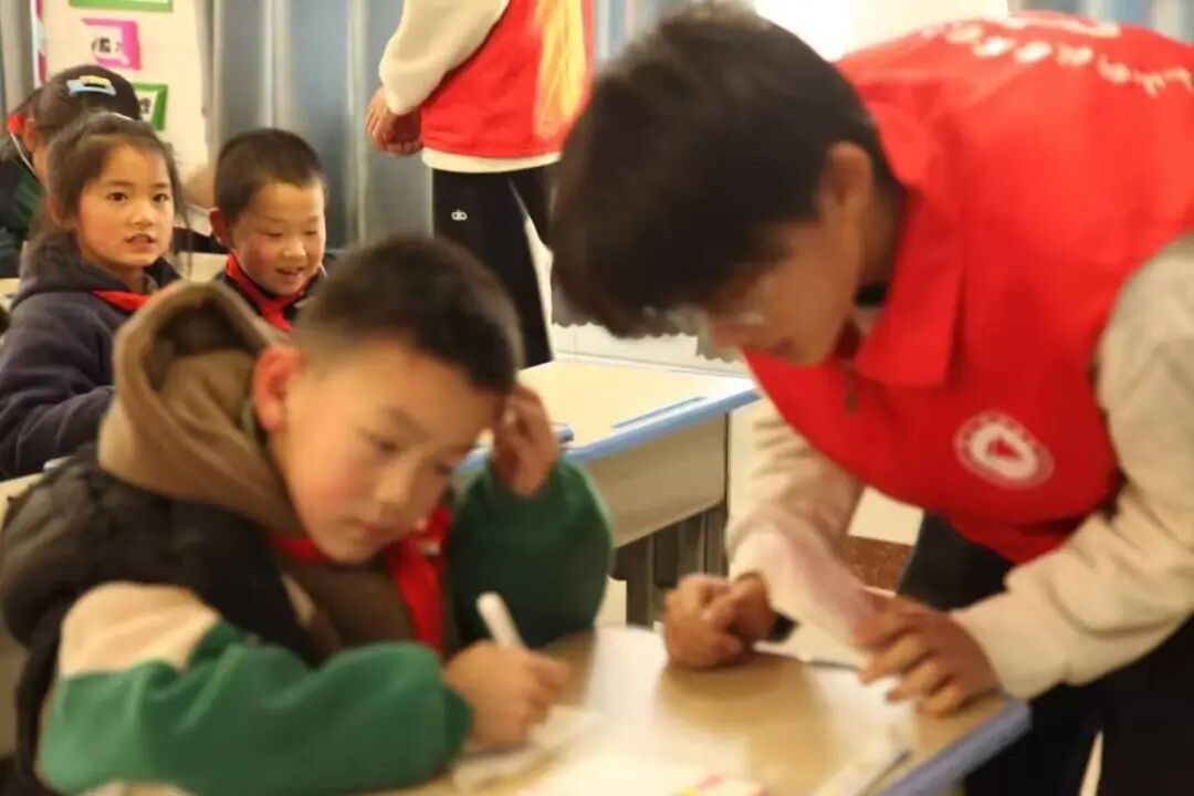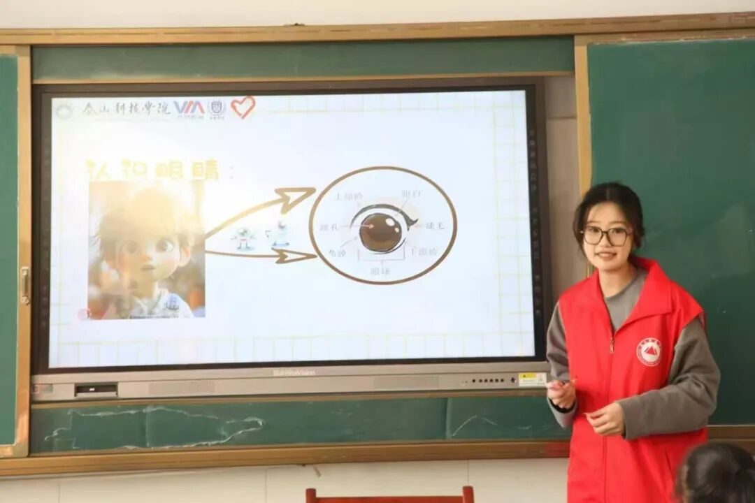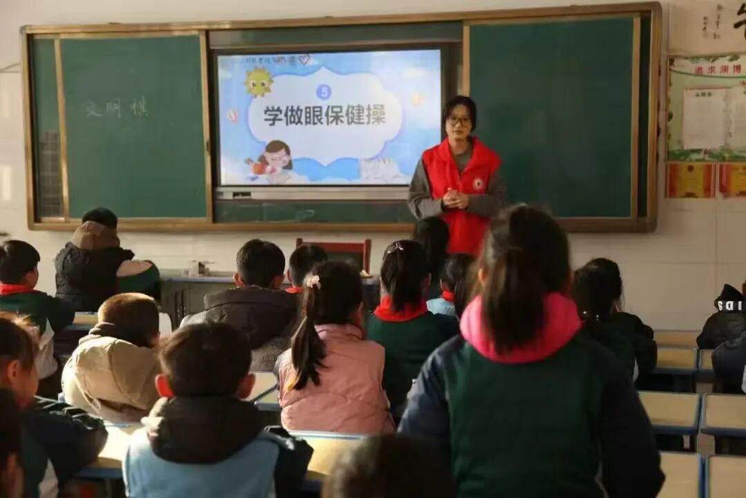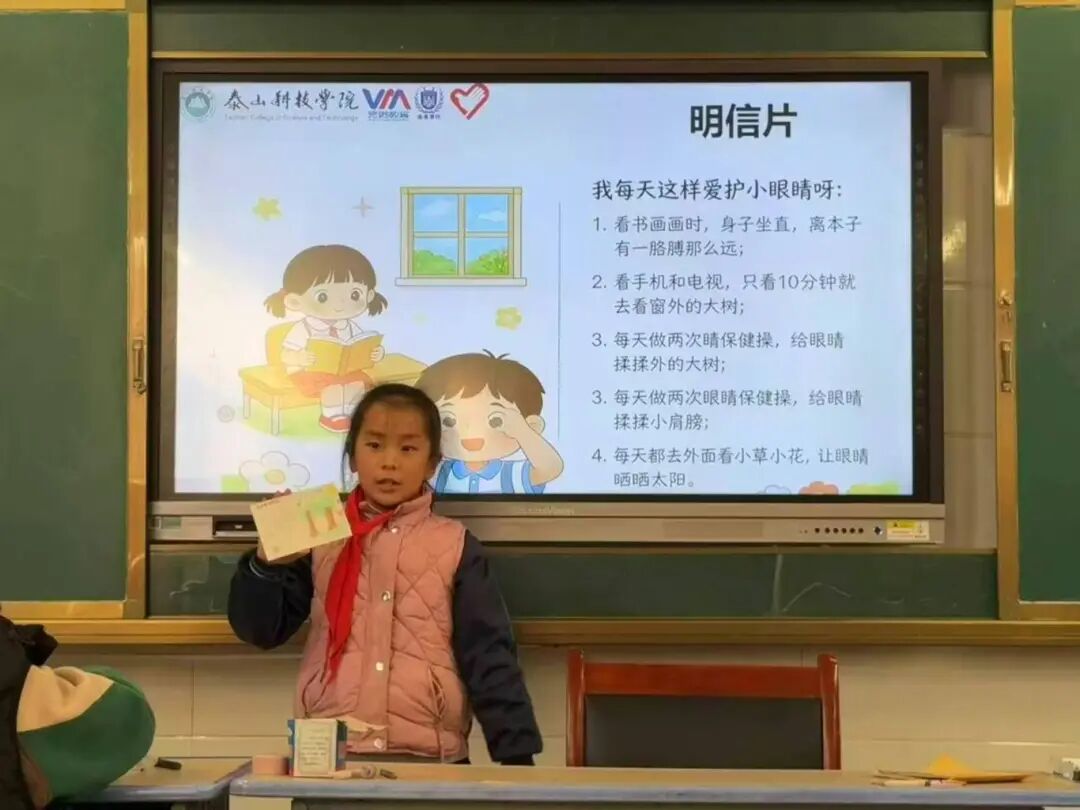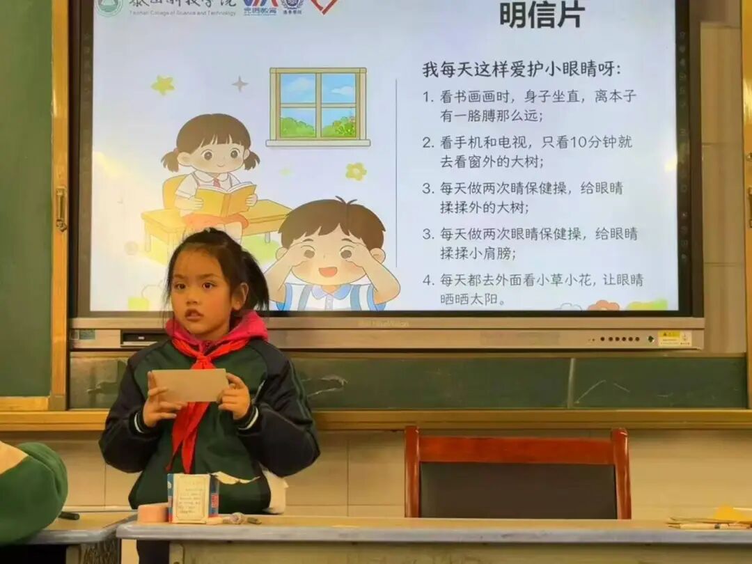远景学院编者按:为响应全国儿童青少年近视防控宣传月号召,让护眼知识“趣”学“巧”记,12月05日,泰山科技学院远景学院关“EYE”行动志愿服务队走进山口镇中心小学,开展了一场集知识科普、趣味互动、眼操教学与创意明信片绘制于一体的沉浸式爱眼活动。孩子们在欢声笑语中解锁护眼密码,用画笔在明信片上定格对明亮世界的向往。