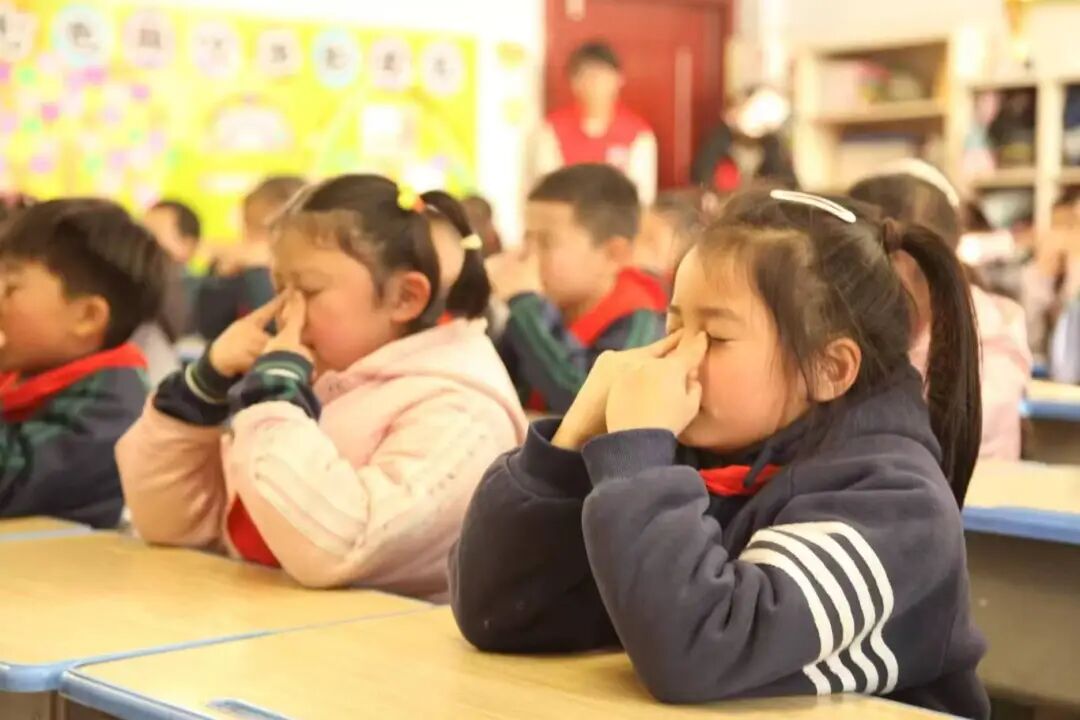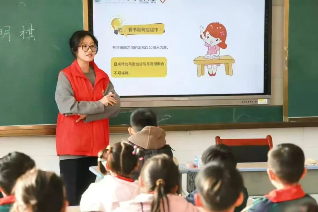“胸口离桌沿一拳、眼睛离书本一尺、手指离笔尖一寸!”坐姿大比拼中,孩子们挺直腰背,对照PPT上的标准示意图调整姿势,志愿者逐一检查指导。现场还响起朗朗上口的护眼儿歌:“小眼睛,眨呀眨,二十分钟歇一歇,窗外绿树望一望”,简单好记的歌词让光线充足、控制时长、不挑食等护眼要点深入人心。