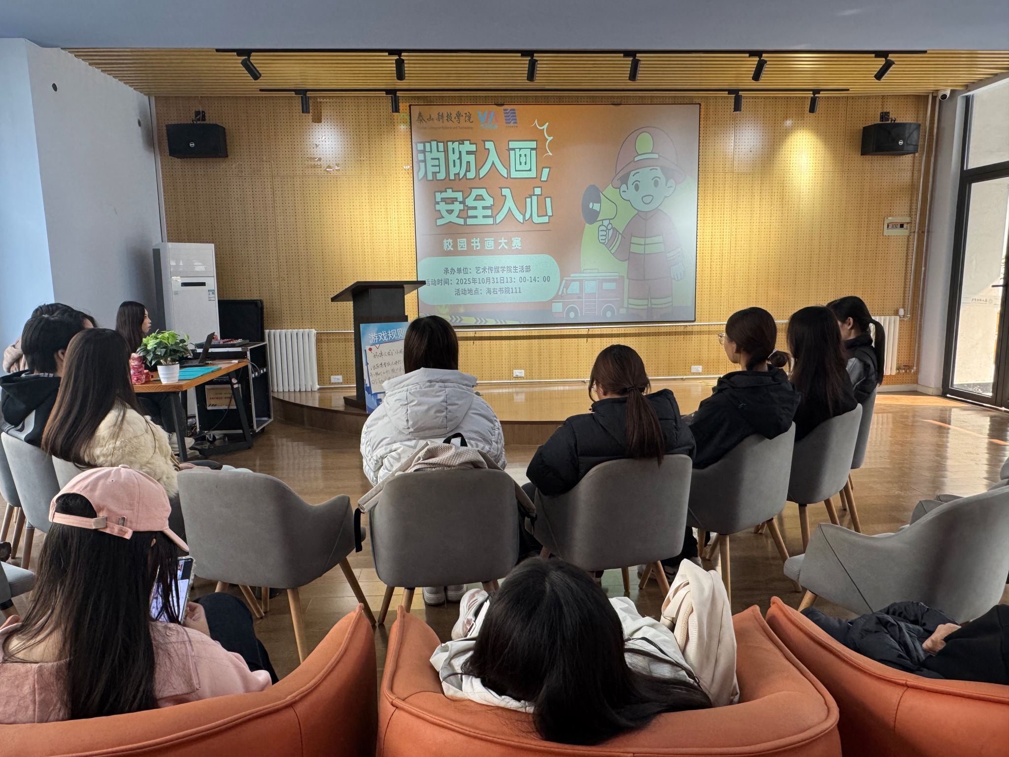 线下颁奖活动中,获奖情况通过邮件形式提前告知参赛同学,现场氛围热烈。同学们在交流中分享创作思路,进一步深化了对消防知识的认知。辅导员亓迪于现场,专注聆听同学们的创作思路,仔细品鉴每一幅消防主题书画作品。在点评过程中说到:“同学们在作品中展现的艺术才华与对消防主题的深刻理解。”在针对作品的细节处理、主题深化等方面提出了建设性意见,引导同学们在艺术创作中进一步强化消防安全意识的表达,让每一幅作品都成为传播消防知识、弘扬安全文化的生动载体。