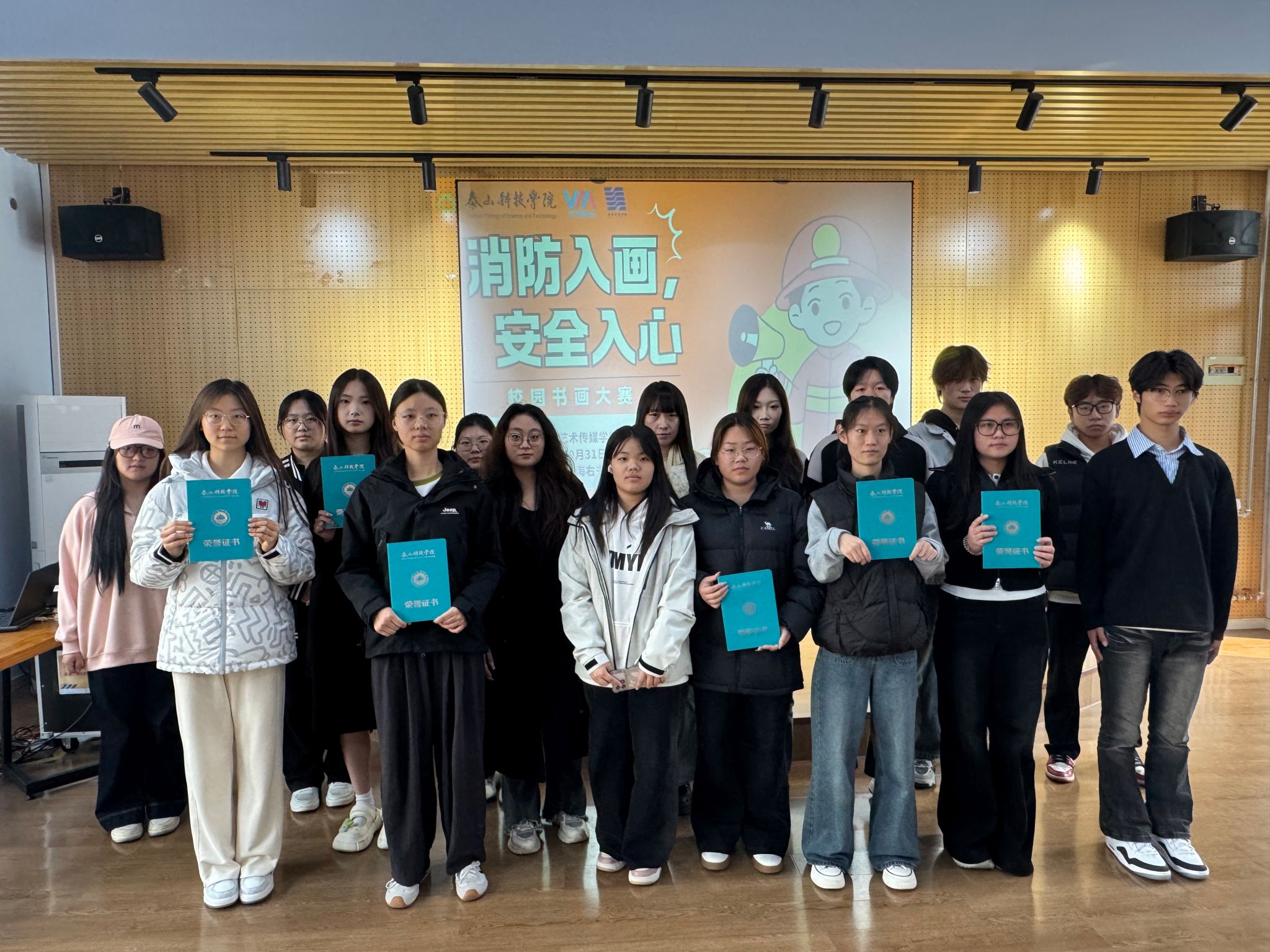 颁奖环节,一本本制作精美的荣誉证书郑重地递到获奖同学手中,每一本证书都承载着学院对学子们艺术创作的肯定与对他们传播安全理念的鼓励。这份荣誉不仅是对他们书画技艺的认可,更是对他们用艺术笔触诠释消防意义、传递安全意识的莫大褒奖,激励着他们今后继续以艺术为桥,践行安全传播的责任。