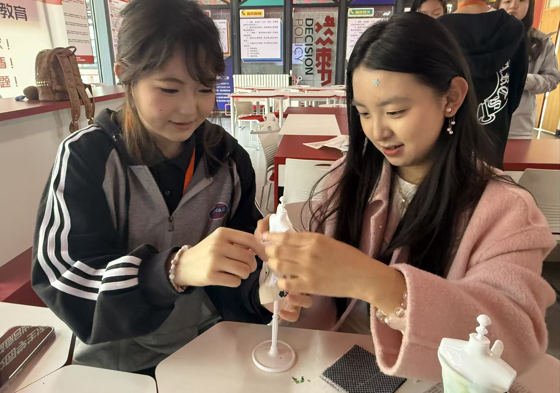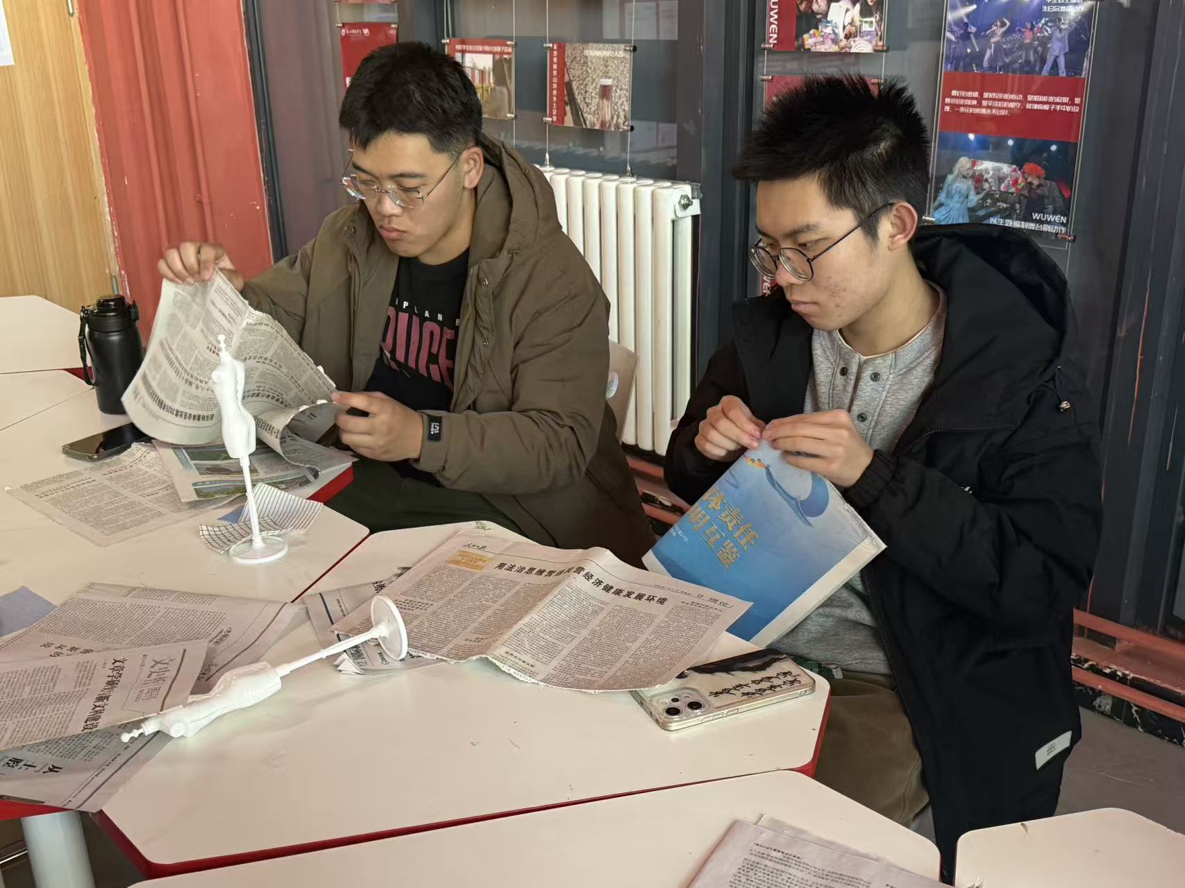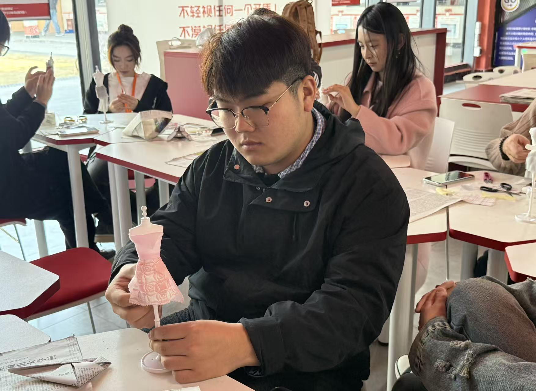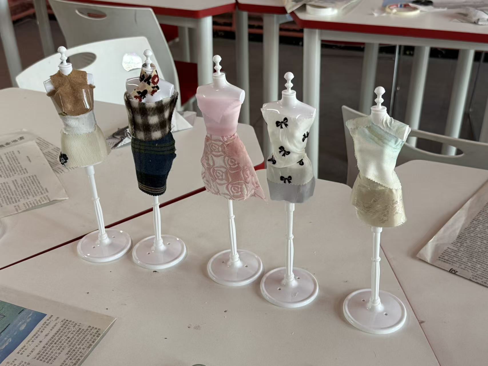 活动现场,同学们两至三人一组,围绕28厘米迷你人台展开创作。碎布、旧报纸、塑料包装袋这些常被忽视的材料,在一双双巧手中化腐朽为神奇。紧扣政务办公、行政统筹、公共服务等真实场景,大家将利落线条、规整版型与实用细节融入设计:带有文字肌理的报纸,化为办公风独有的质感;可塑性极强的塑料,塑造出挺括飒爽的职场轮廓;缤纷的碎布拼接,织就秩序与美感并存的纹样。一件件迷你职业装,既是环保创意的生动呈现,更将行管学子内化于心的专业气质,凝练为可见可感的艺术表达。