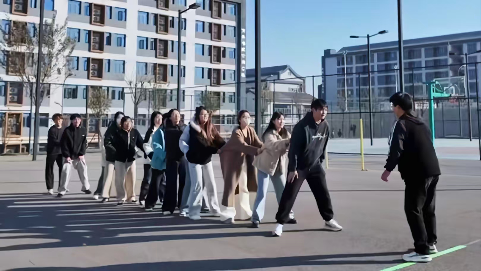 老鹰捉小鸡比赛让现场瞬间回归童真,同学们分为两队交替扮演“老鹰”“母鸡”和“小鸡”。“母鸡”张开双臂全力守护身后的“小鸡”队伍,“小鸡”们紧紧跟随、灵活躲闪,“老鹰”则眼神锐利、敏捷穿梭,试图突破防线捕捉“小鸡”。两分钟的比拼中,羽毛球场变成欢乐的海洋,同学们奔跑、躲闪、欢笑,尽情释放青春活力。辅导员刘硕也情不自禁加入队伍,与同学们一同体验童年游戏的快乐,现场氛围温馨而热烈。