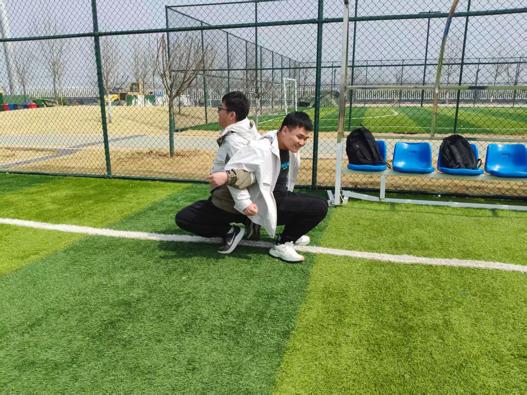 第三个项目“同心共立”看似简单,却是最考验信任与协作的一关。同学们自由配对,两人背对背坐下,双臂相扣,需要依靠互相背部支撑的力量同时站起来。起初不少组合尝试失败,但大家没有放弃,不断调整姿势互相鼓励。当一对对组合成功站立时,现场响起阵阵掌声。这个项目让同学们深刻体会到,只有彼此信任、步调一致,才能共同克服困难。