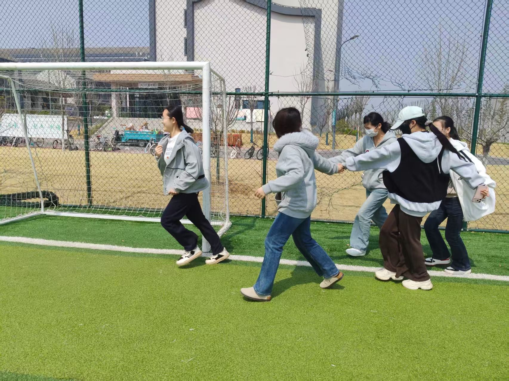 第二个项目“渔网猎鱼”将活动推向高潮。起初两名同学手拉手组成“渔网”,其余同学化身“鱼儿”在区域内奔跑躲避。渔网必须全程拉手不松开,随着一条条“鱼儿”被捕获,渔网越来越庞大,抓捕难度也逐渐增加。鱼儿们左躲右闪,渔网则紧密配合步步紧逼,整个过程笑声不断,同学们在奔跑中释放了压力,也在配合中增进了默契。