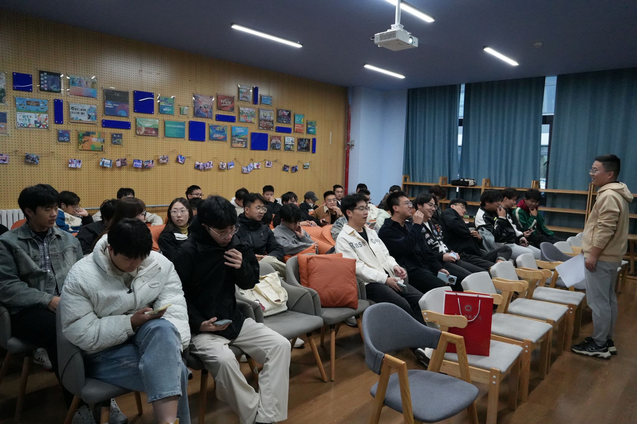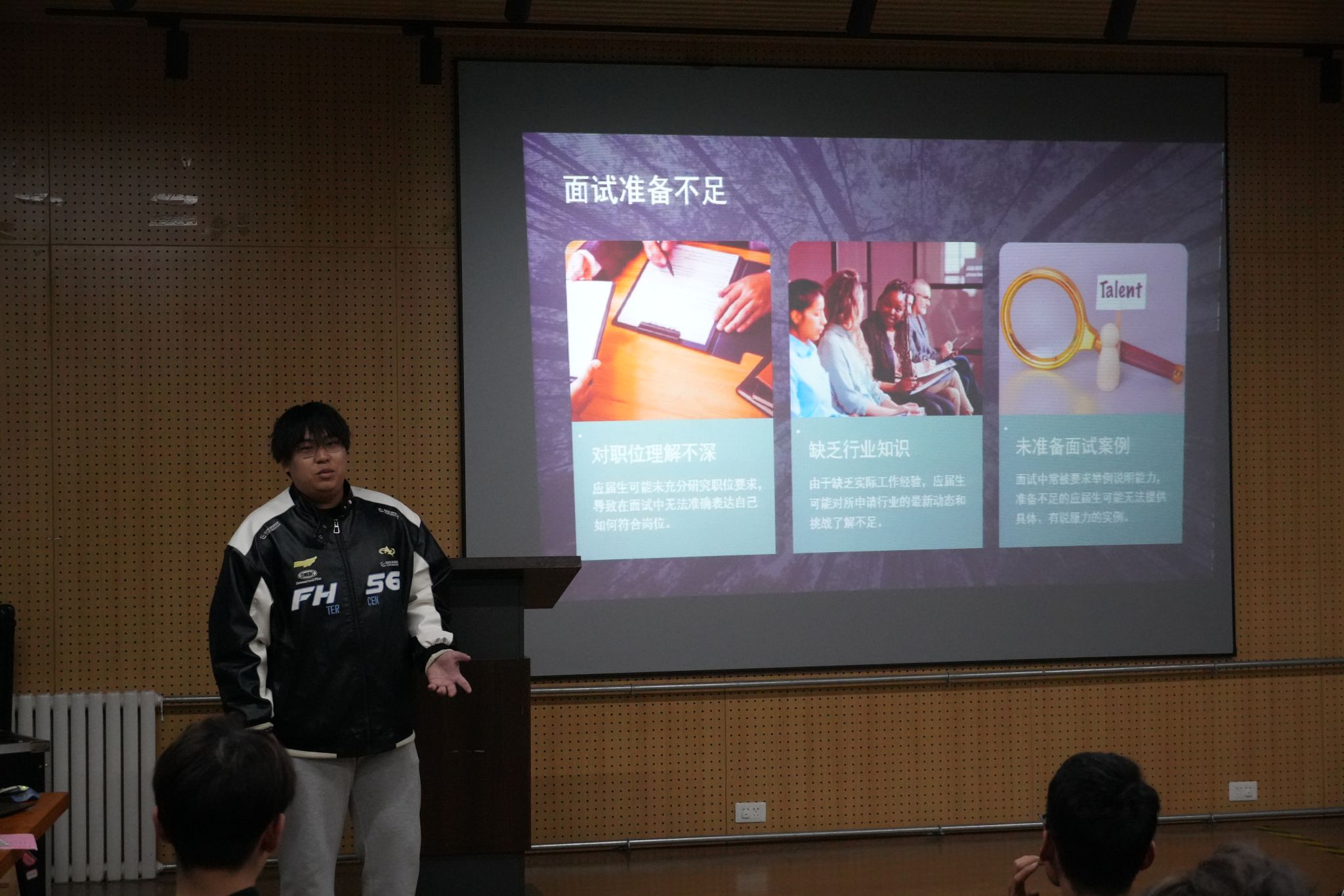 全体同学到齐之后,活动在热烈欢迎的掌声中开始。首先由孙朋老师开始对同学进行了活动介绍,并为大家讲述了当前就业形式的严峻和自己对于就业的一些见解和经验,并欢迎侯保山同学为同学们介绍学校修建的AI面试仓和如何利用面试仓对面试的帮助,并基于在面试仓的面试可以对自己的简历做出适合的修改。因为应届生面试时常陷入多重困境:肢体语言僵硬导致亲和力不足而被面试官扣分,价值表达模糊使专业优势被掩盖,近半数学生无法在2分钟内清晰阐述项目成果。此外,简历与岗位需求脱节,进一步加剧求职成功率走低。