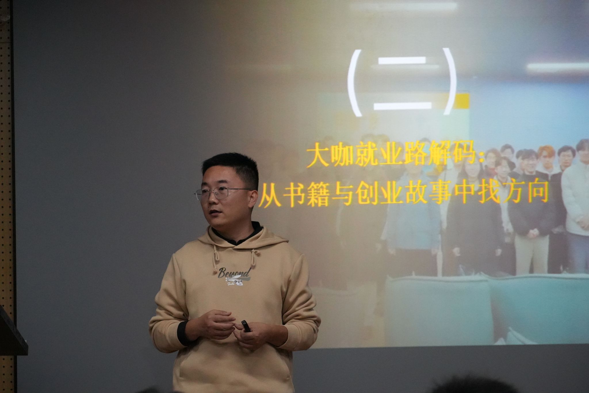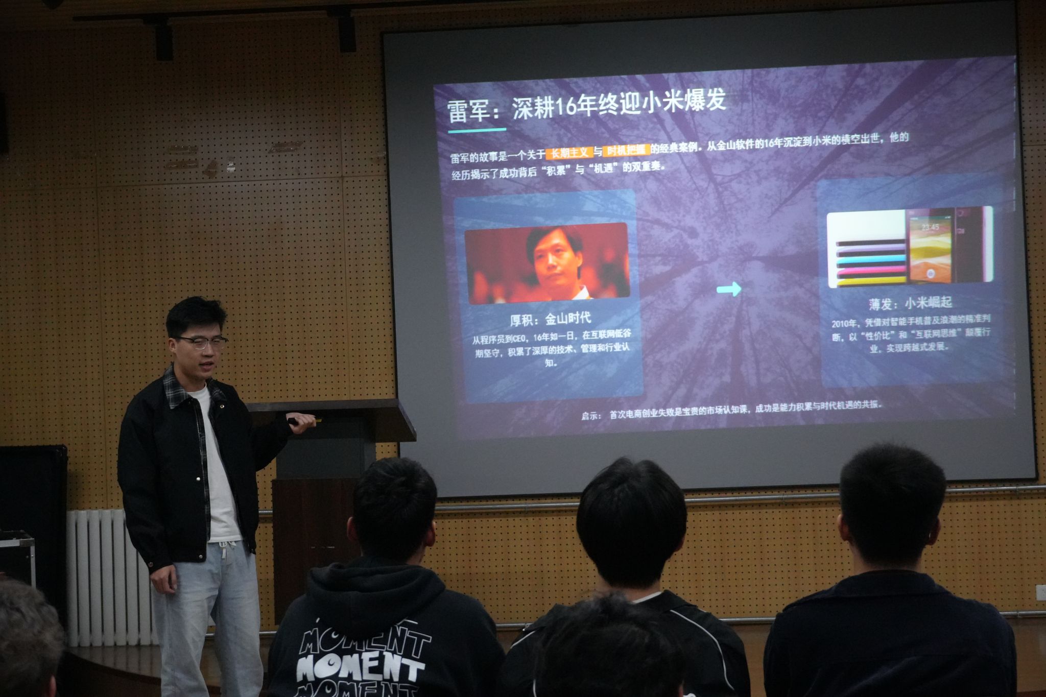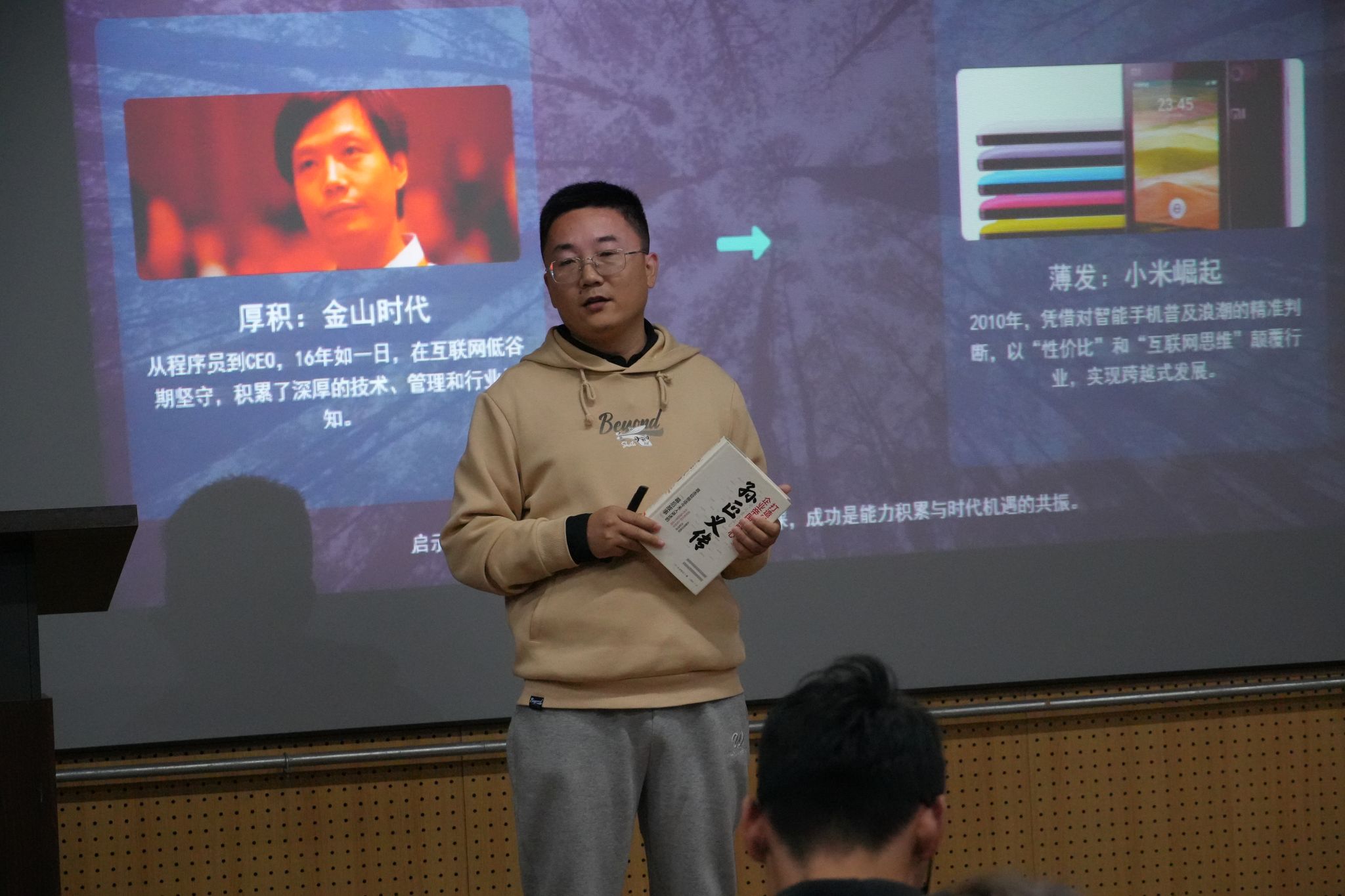 第二个环节是对大咖就业路解码:从书籍与创业故事中找方向,首先又王金涛同学讲解他对于大咖阅读后的见解,他讲述了雷军在金山软件的16年深耕,锤炼出对互联网产品的敏锐嗅觉,其"顺势而为"的理念启示学子需在机械领域积累核心技术壁垒;刘强东从中关村柜台到京东帝国的蜕变,印证了"小步快跑"策略的价值,早期通过实体零售验证商业模式的经验,为技术人才提供了从0到1的落地思路;孙正义在软银成立初期便布局人工智能赛道,这种跨越周期的战略眼光,提醒机械学子需关注智能制造、工业4.0等前沿方向。三位领袖虽路径各异,但持续学习与快速迭代的特质贯穿始终。最后由孙朋老师来做最后的总结。