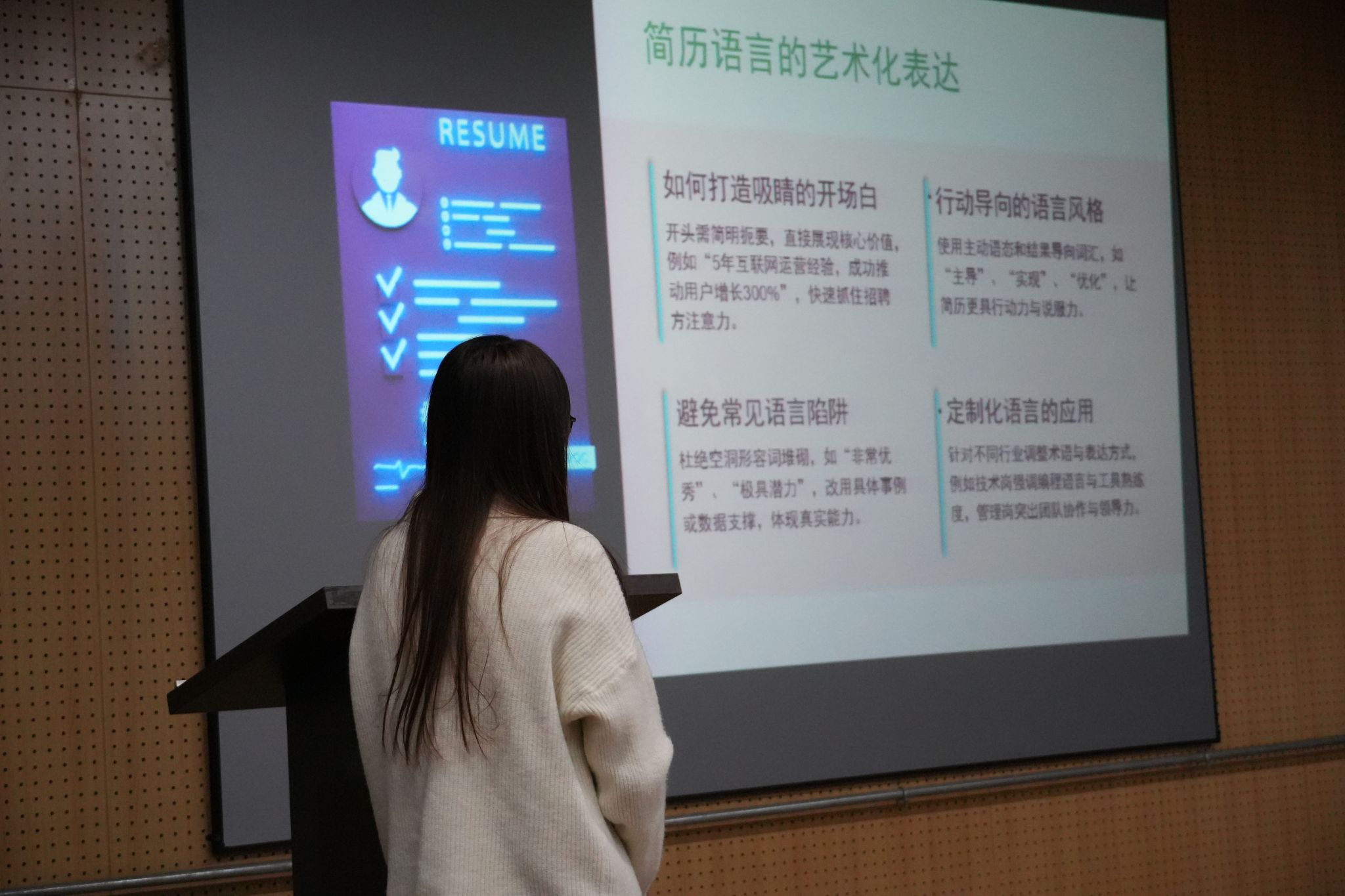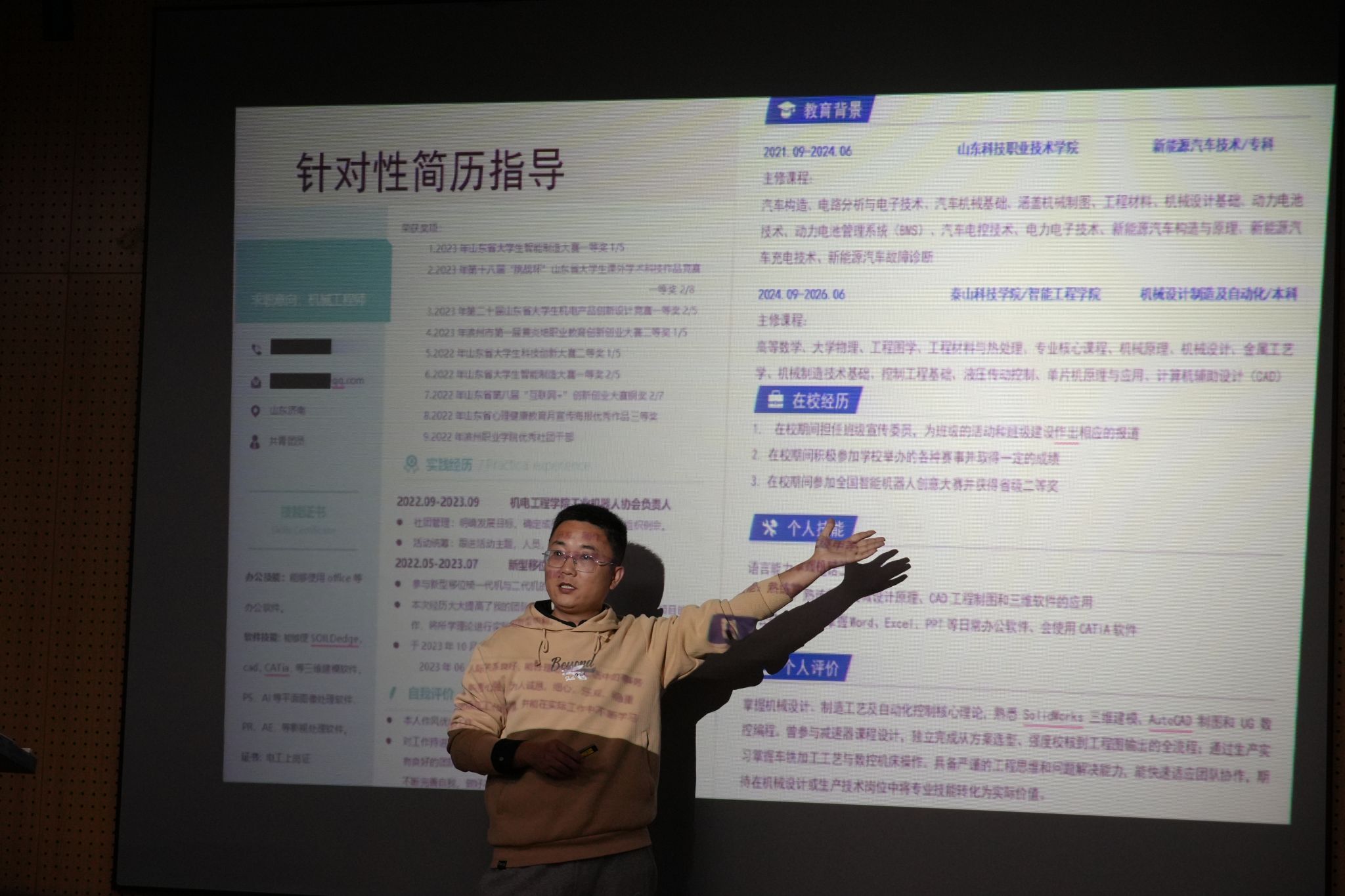 第四个环节是个人简历精修:从优劣分析到针对性修改指导,本环节由李盈同学讲解收集的本班同学的简历进行对比分析其中的优劣和需要改进的地方,解读招聘简章时,需重点关注"负责""参与""推动"等动词差异,精准定位岗位权责;通过"优先""熟悉""掌握"等程度词判断技能刚需等级。或通过脉脉等职场社交平台挖掘员工背景共性。然后由孙朋老师根据自己的经验和现场展示的简历进行指导,指出展示的简历的优点和不足,然后再指出简历中需要优化的地方,如简历每个篇幅的长短、个人技能的书写和获奖情况如何介绍等简历的优化方法。