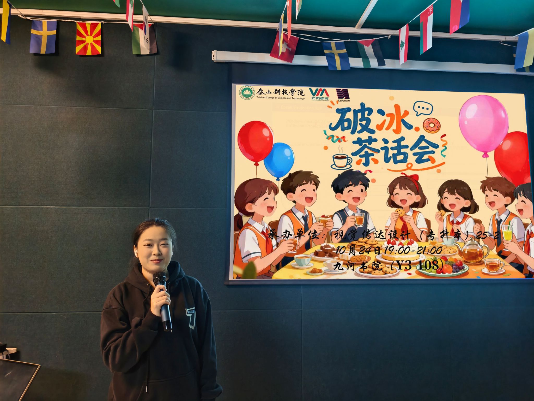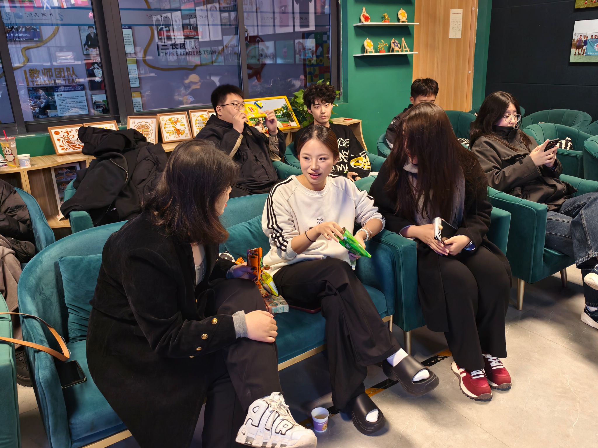 随着活动室里暖光灯的亮起,艺术传媒学院视觉传达设计(专升本)25-2班精心策划的破冰茶话会活动正式拉开帷幕,直至晚上九点活动落幕。这场持续两小时的聚会始终充盈着欢声笑语,成为大家打破陌生、联结友谊的温暖起点