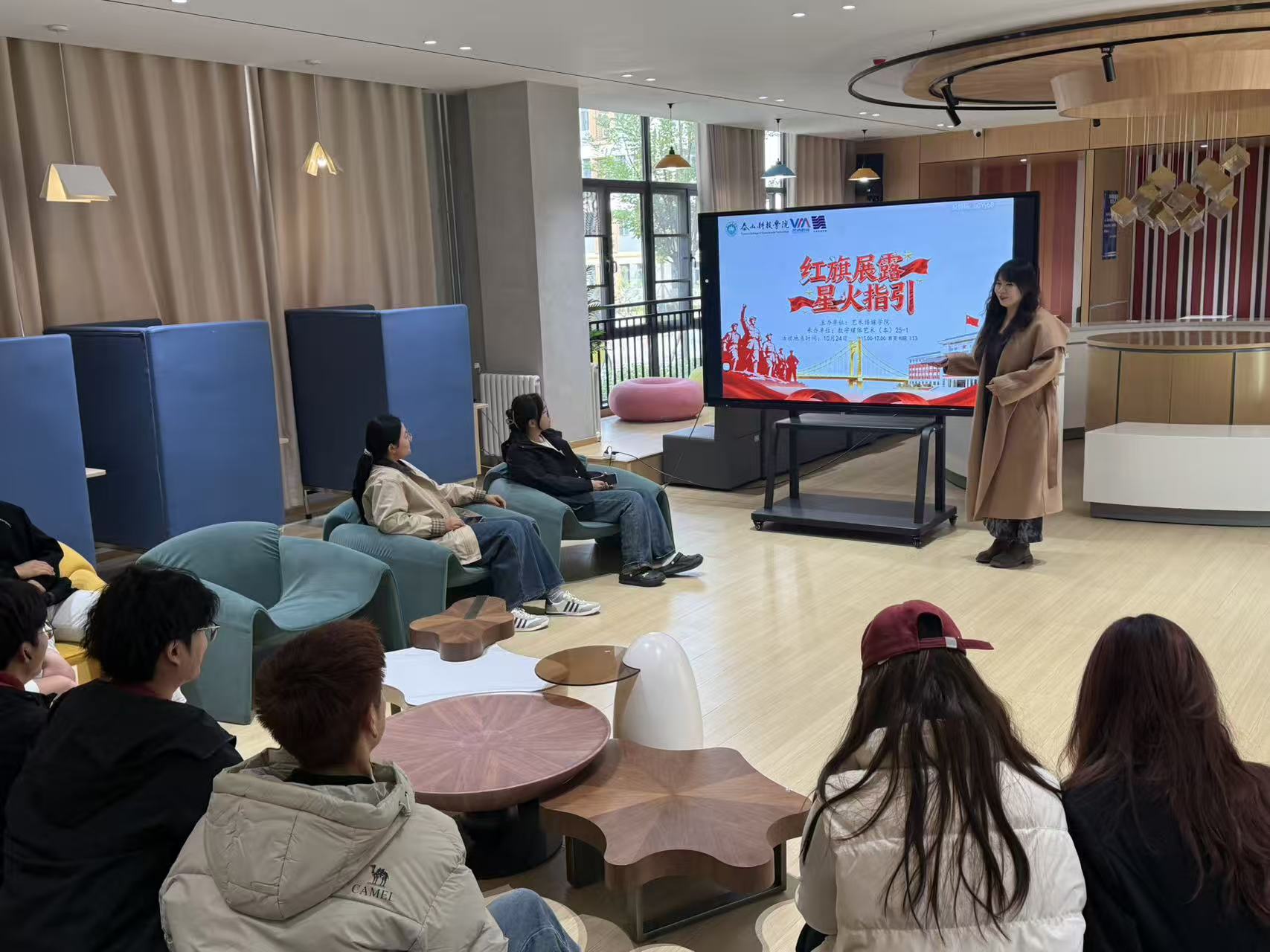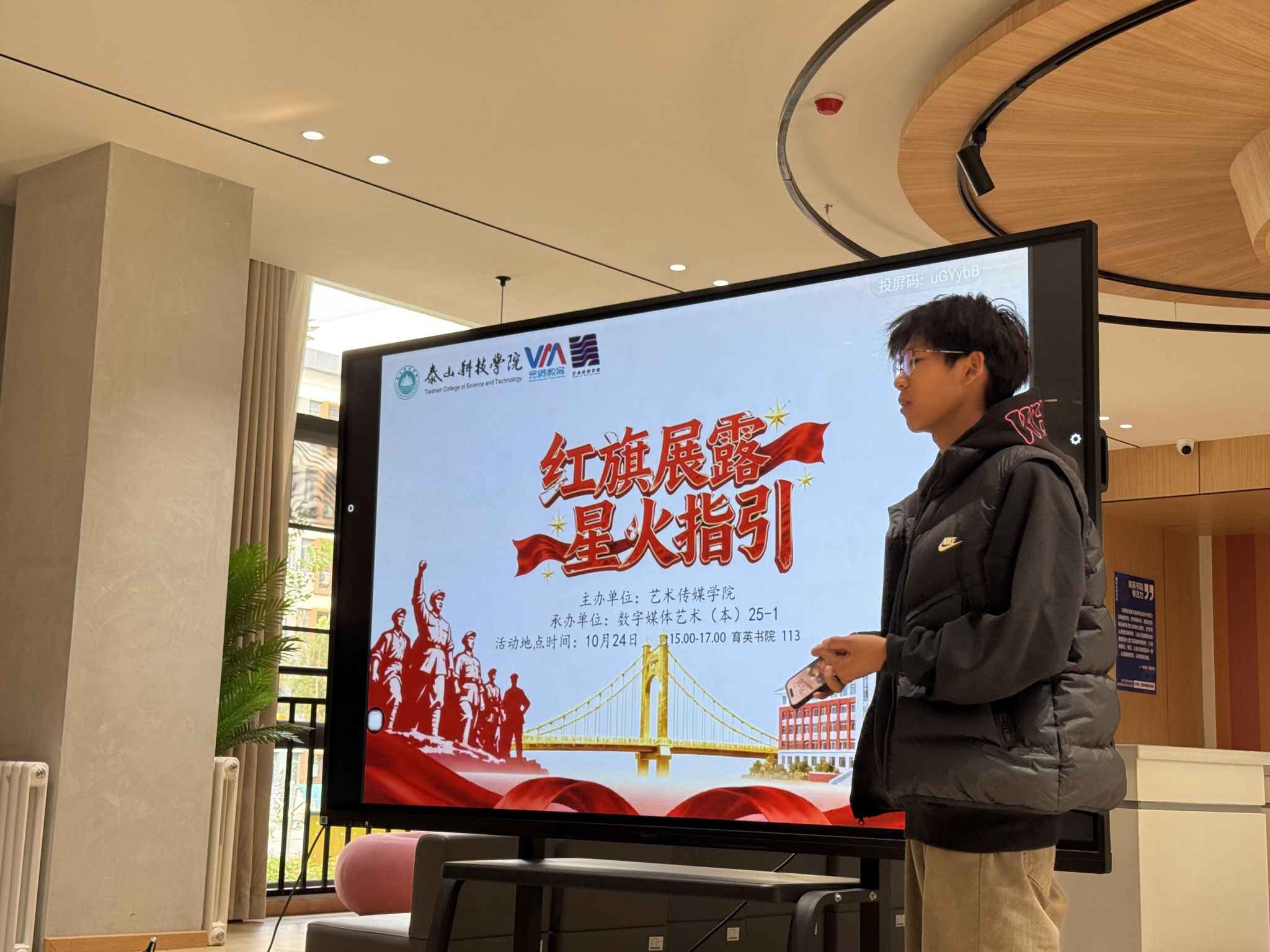 2025年10月24日15:00-17:00,泰山科技学院艺术传媒学院于育英书院113举办“红旗展露 星火指引”主题活动,本次活动由艺术传媒学院主办,数字媒体艺术(本)25-1班承办,旨在通过丰富的红色文化浸润形式,引领学子在历史回溯中汲取奋进力量。