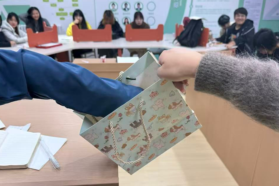 抽奖环节成为一大亮点。现场,充满童趣图案的抽奖袋传递着惊喜,同学们在期待与欢笑中参与其中。这一环节不仅为破冰活动增添了趣味,更在随机抽奖的互动中,让班级成员间的距离进一步拉近,为整场破冰活动画上了一笔欢乐且温馨的色彩,助力班级凝聚力在趣味互动中悄然提升。