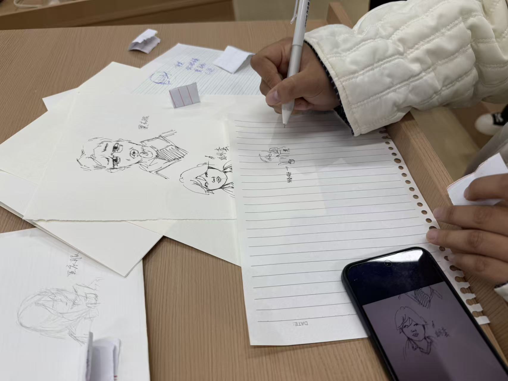 活动中,同学们化身“灵魂画手”,用线条勾勒出同学的鲜明特征:或是标注“黑衣服”的时尚身影,或是突出“戴耳机、戴眼镜”的独特标识,还有对同学“非常漂亮、头发细长、有美甲”的生动描绘……每一幅画像都饱含创意,每一个关键词都精准抓眼。从速写的笔触到文字的点睛,同学们在画与猜的互动中,不仅展现了对身边人的细致观察,更让班级氛围在欢声笑语中愈发融洽。