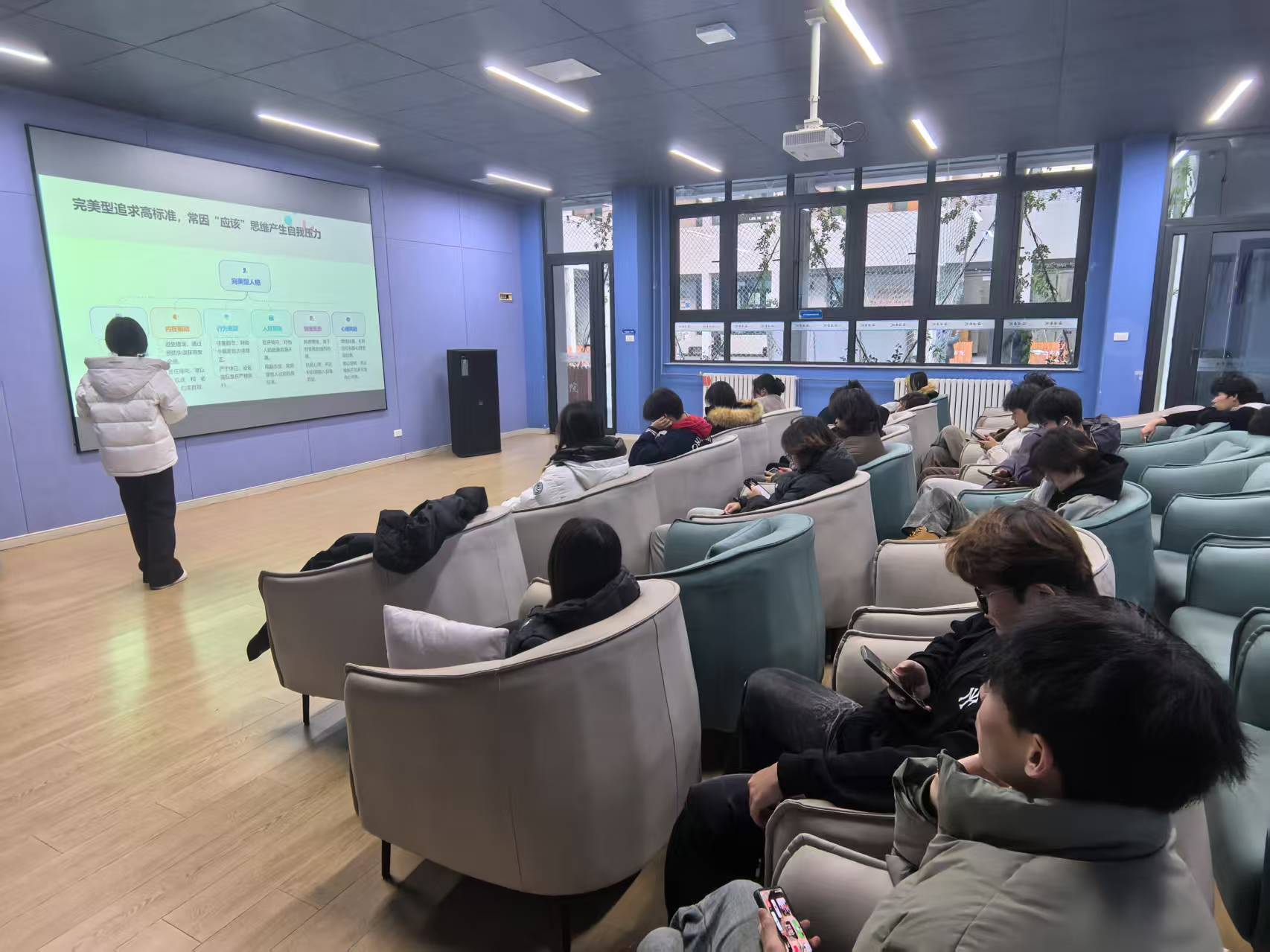 自活动筹备以来,班级团支部高度重视,围绕“自我认知 + 人际提升 + 团队凝聚” 三大核心目标制定详细方案。前期策划阶段,团支部通过指尖派平台发布活动通知,清晰告知活动主题、时间、地点及参与意义,便捷高效地完成了报名统计工作,确保全员知晓、积极参与。同时,团队明确了各环节核心任务,成立前期准备组、秩序维持组、后勤保障组三大专项小组,明确分工、各司其职 —— 前期准备组由于硕雅、宋思凝同学牵头,聚焦 PPT 制作与人员组织,反复打磨内容,确保九型人格理论讲解兼具专业性与趣味性;秩序维持组以姜向轩同学为核心,提前调试指尖派签到签退系统,保障活动流程有序推进;后勤保障组则全力落实场地布置、物资采购等筹备工作,为活动顺利开展筑牢基础。