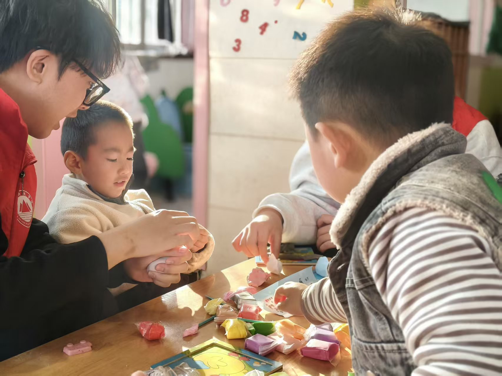 在随后的创意手工环节,孩子们在大学生志愿者“一对一”或“一对多”的陪伴指导下,开始了超轻粘土的创作之旅。五彩的粘土在孩子们手中被赋予了无限可能:有的孩子捏出了圆滚滚的饺子,精心刻画着饺子的皱褶;有的创作了憨态可掬的雪人,用不同颜色的粘土为雪人戴上帽子和围巾;还有的发挥想象,制作了象征团圆的汤圆、寓意吉祥的福袋等作品。