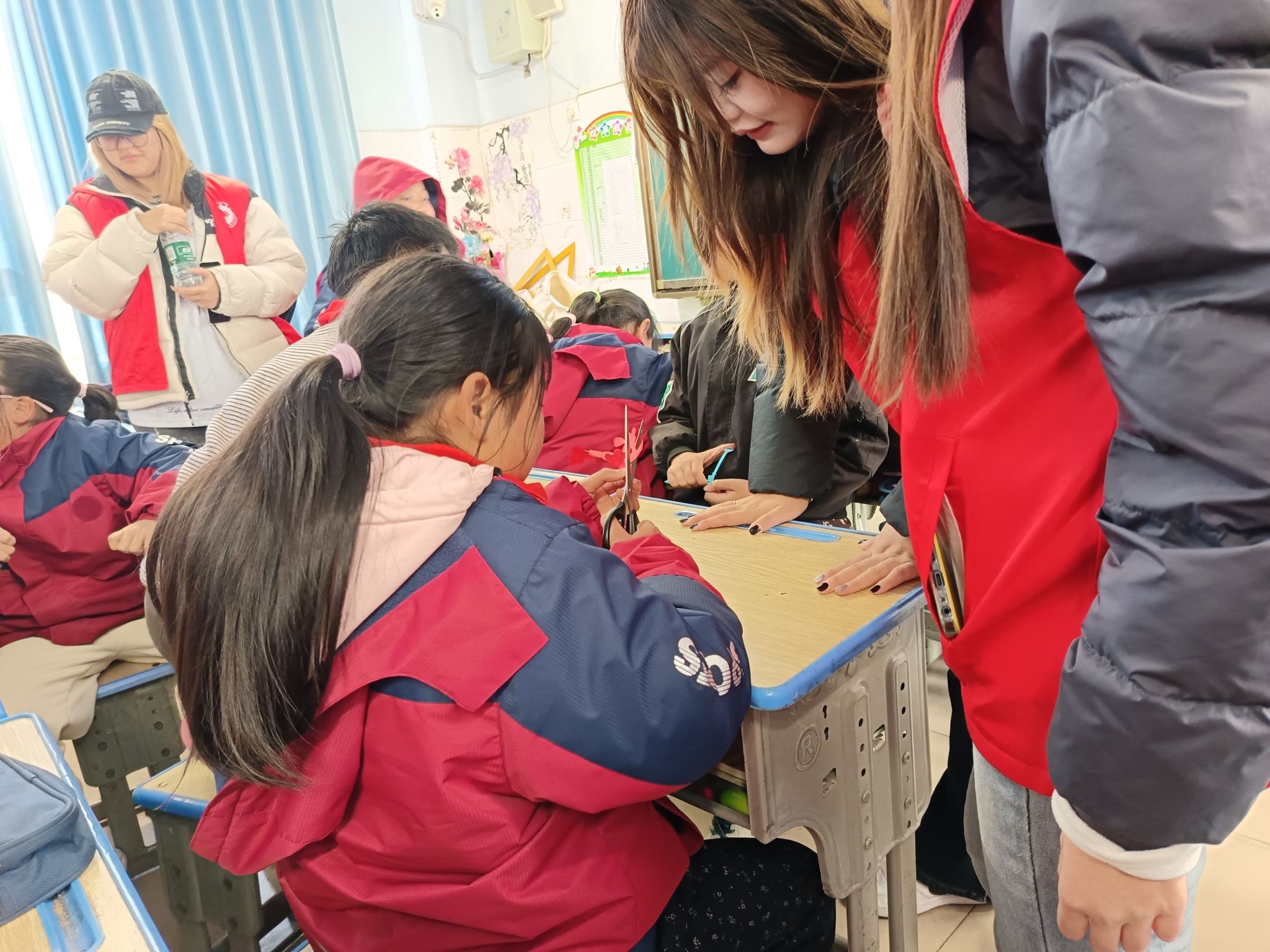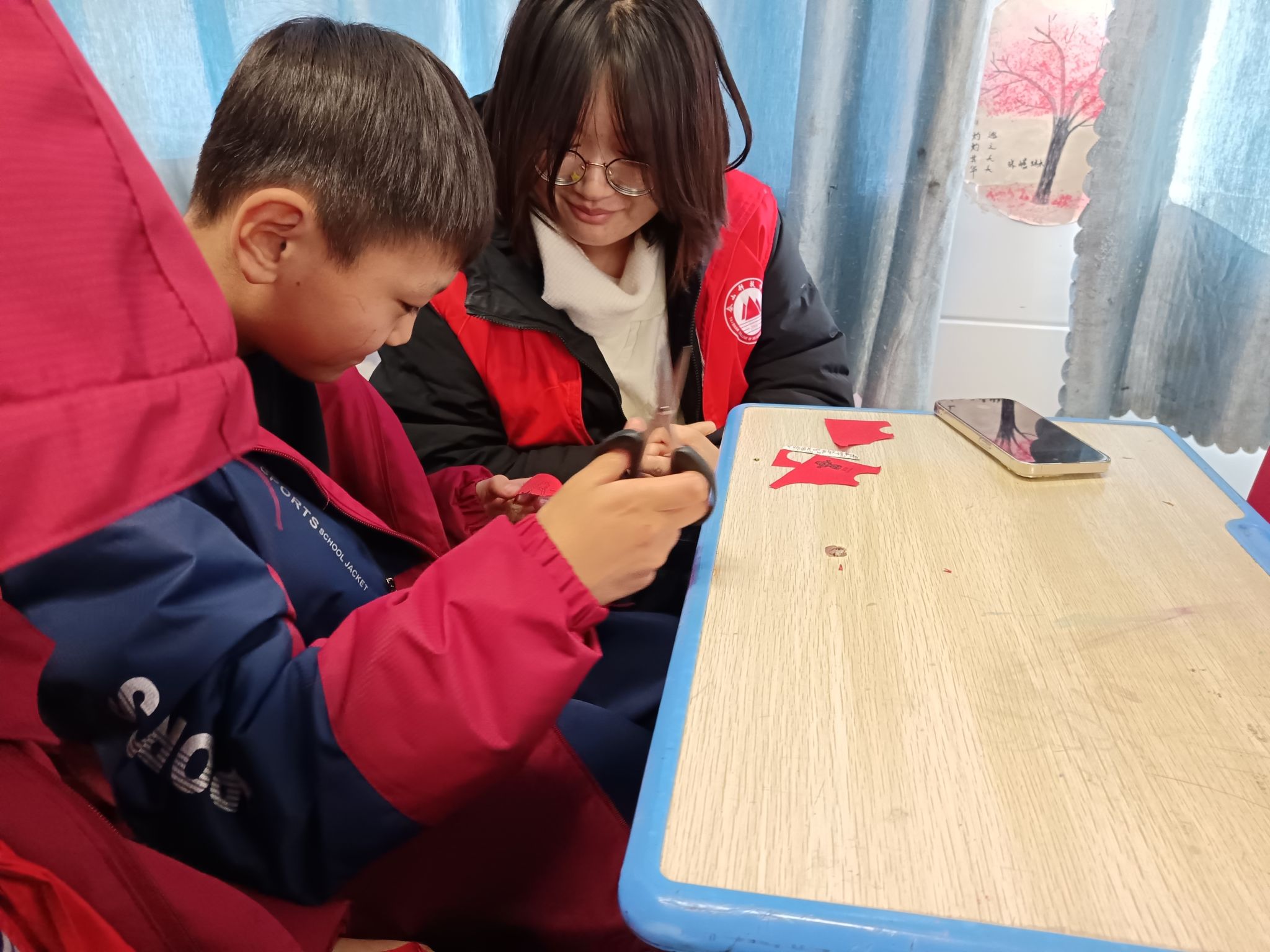活动策划阶段,组织者进行了深入调研和周密准备。从11月17日开始,策划团队就开始了为期一个月的准备工作。“我们希望通过这次活动,达到三个层面的目标。”活动策划:“知识层面,让学生了解剪纸的历史渊源;能力层面,提升学生的动手操作能力;情感层面,激发学生对传统文化的认同感。”志愿者招募工作同步展开,最终选拔出12名具备良好沟通能力和一定手工艺基础的志愿者。活动前一周,专门组织了剪纸文化知识、制作流程和安全操作规范等内容的培训。物料准备方面,除了基础的彩纸、剪刀、铅笔等工具外,团队还准备了剪纸文化PPT、活动流程海报、志愿者工作证以及富有创意的小礼品。特别值得一提的是,团队还准备了急救包,内含碘伏、创可贴等应急物品,确保活动安全有序进行。