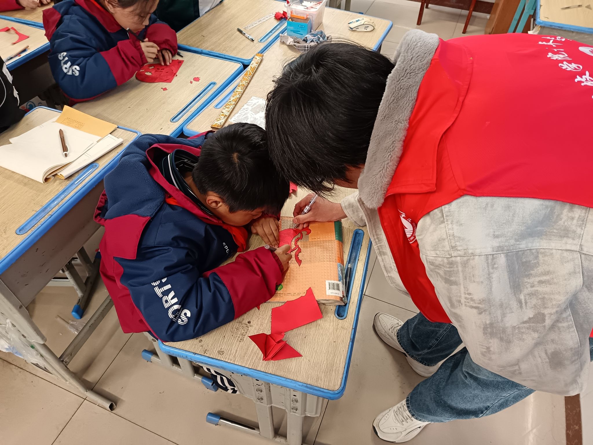文化讲解结束后,活动进入最受期待的环节——“动手实践:剪纸创作体验”。志愿者们分成六组,每组负责指导4-5名学生。“我们先从简单的对称剪法开始。”志愿者耐心地示范着,“将纸张对折,画出图案的一半,沿着线条剪下,展开就是一个完整的对称图案。”最初,一些学生显得有些笨拙,剪刀似乎不太听使唤。但在志愿者的悉心指导下,他们逐渐掌握了基本技巧。剪刀在彩纸上灵活转动,纸屑如雪花般飘落。令人惊喜的是,学生们并没有局限于传统图案。有的剪出了卡通人物,有的创作了未来城市,还有的将家庭成员的剪影融入作品中。“我想剪一只蝴蝶,因为蝴蝶很美丽。”三年级学生小琳腼腆地说。在志愿者的帮助下,她成功完成了一幅色彩斑斓的蝴蝶剪纸。创作过程中,志愿者们不断强调安全注意事项:“使用剪刀时要注意方向,不要对着自己或他人。”“剪纸时要保持桌面整洁,避免纸屑乱飞。”